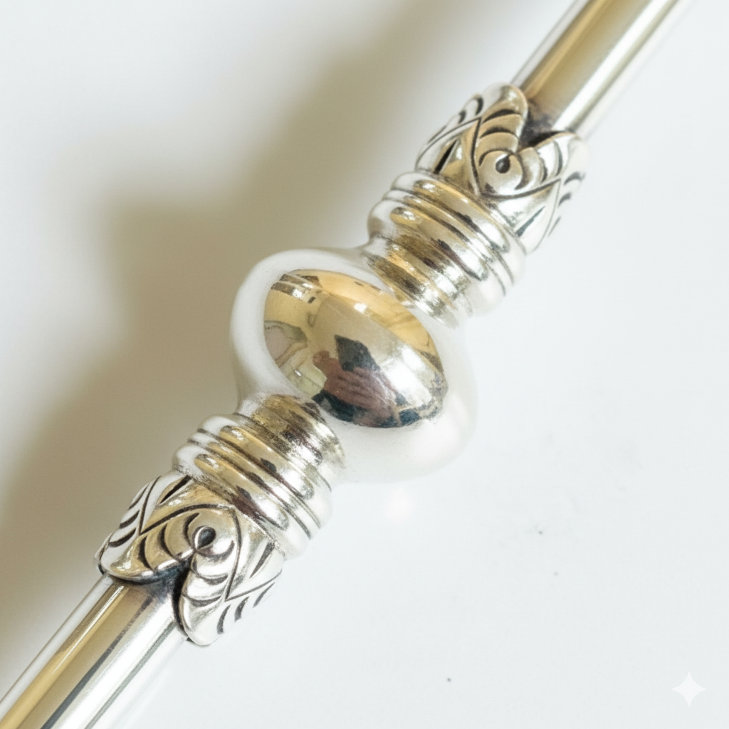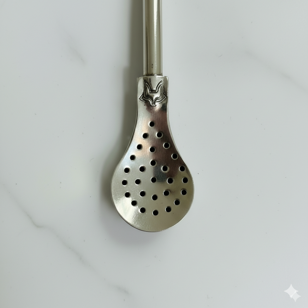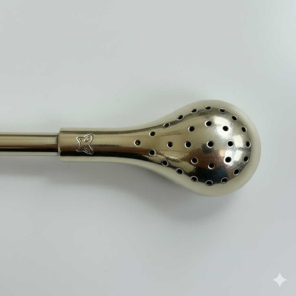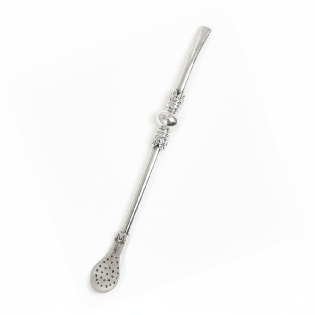 Bombilla premium diseñada en caño de alpaca sin costura de 7mm, con bomba y apliques cuidadosamente trabajados de hojas de acanto limadas y cinceladas, que cumplen la función de disipar la temperatura del agua antes que llegue a tu boca, aportando presencia y solidez, podes elegirla en su forma recta o levemente curvada que garantiza tu comodidad así como carácter y estilo al conjunto.