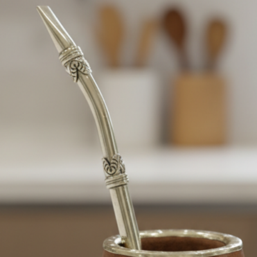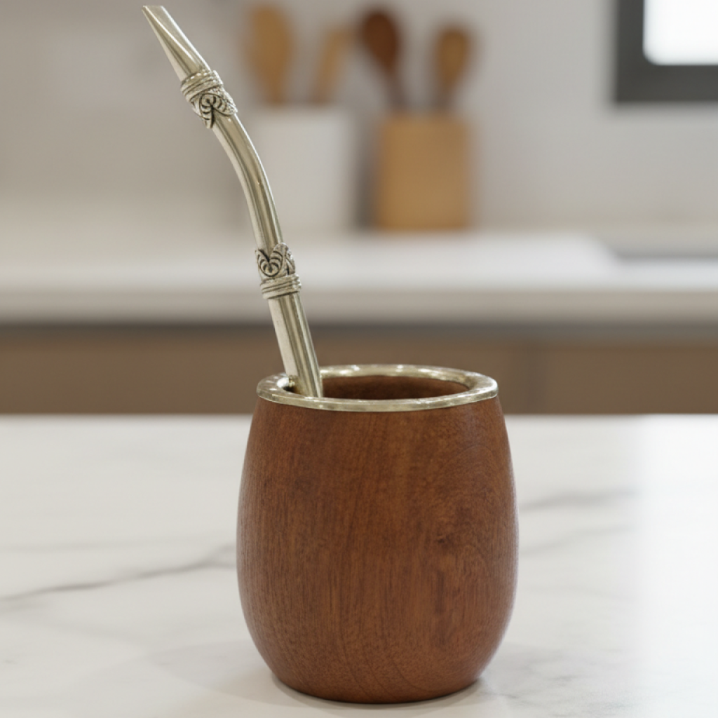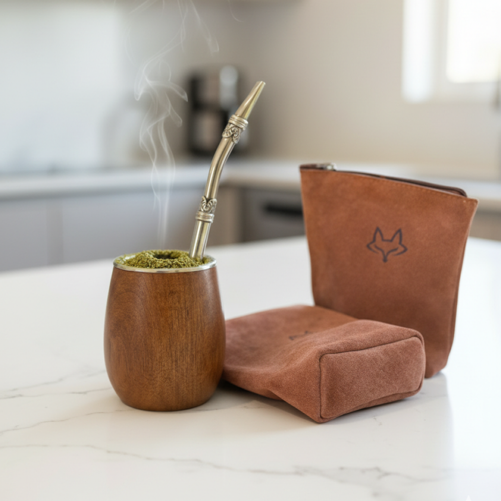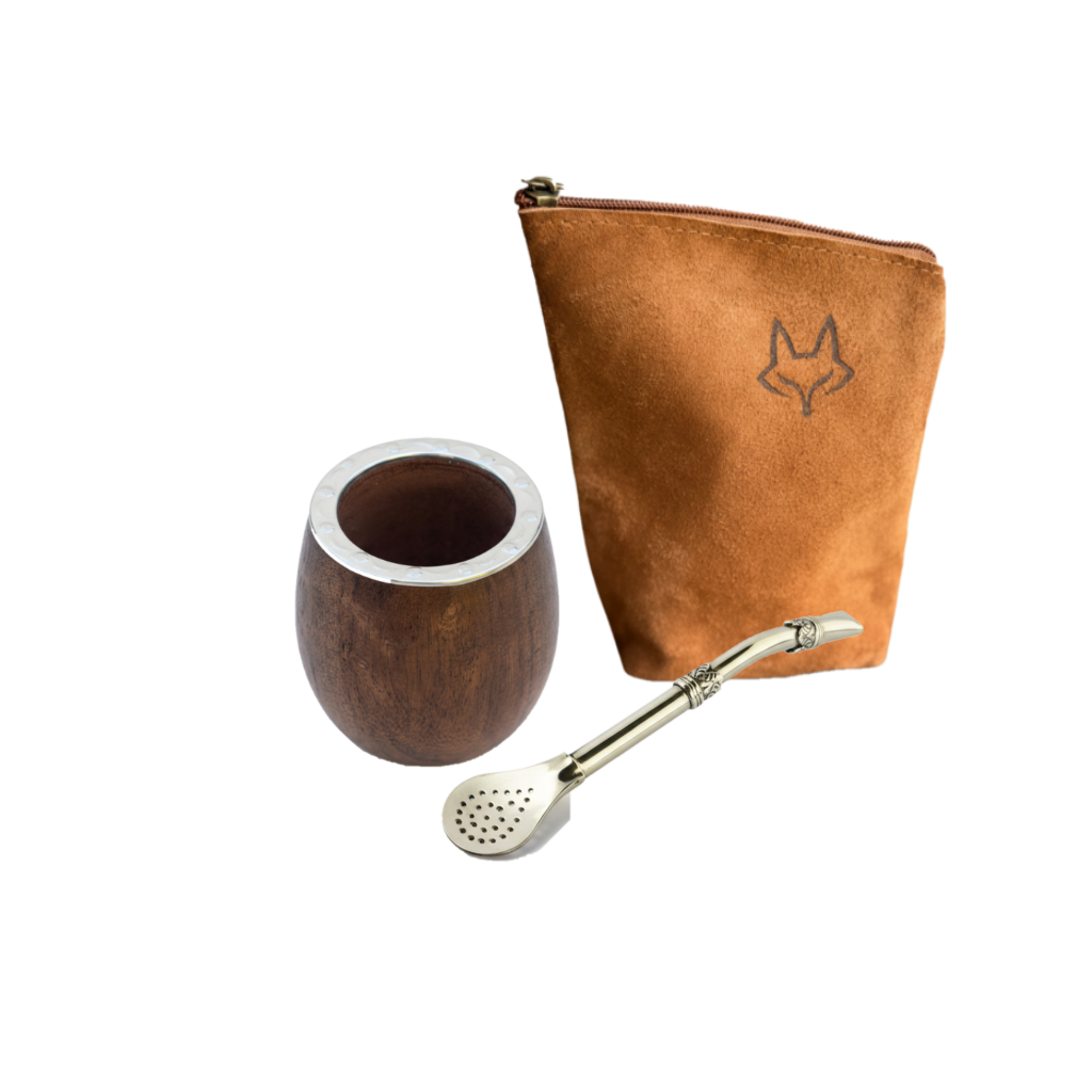 Hermoso conjunto, el mimado por la gente, fabuloso bombillón con apliques y su funda en cuero gamuzado, mate de algarrobo con reluciente virola cincelada y yerbera de cuero gamuzado de 400 gramos con base.