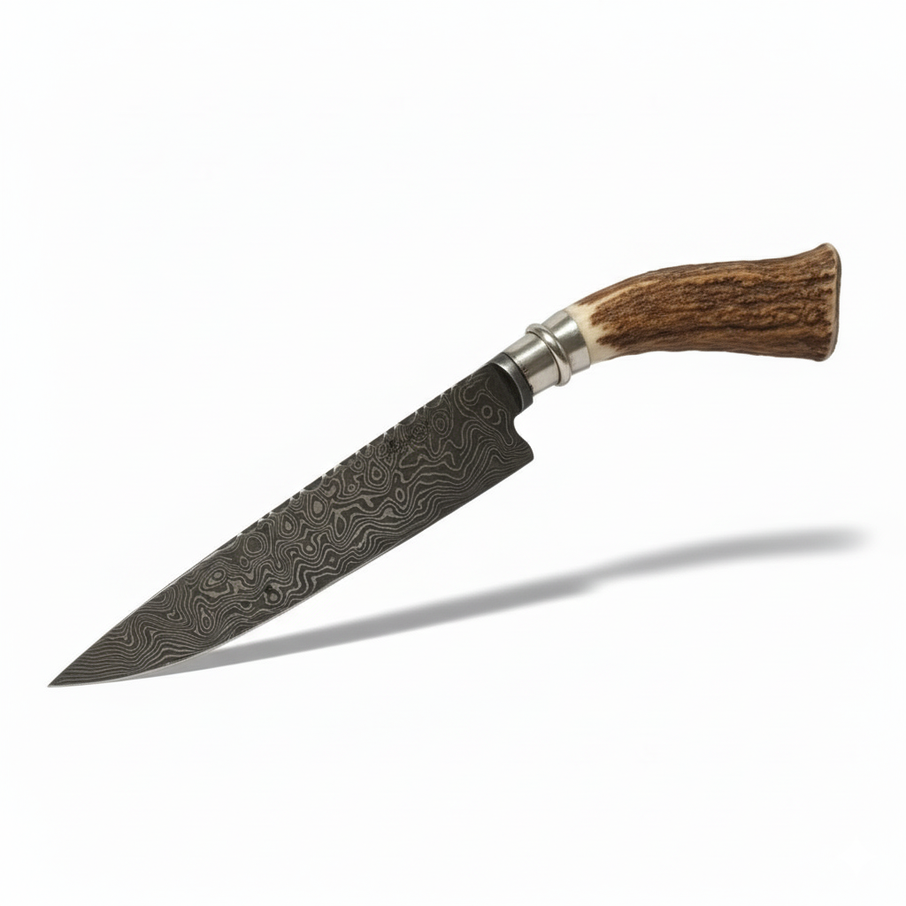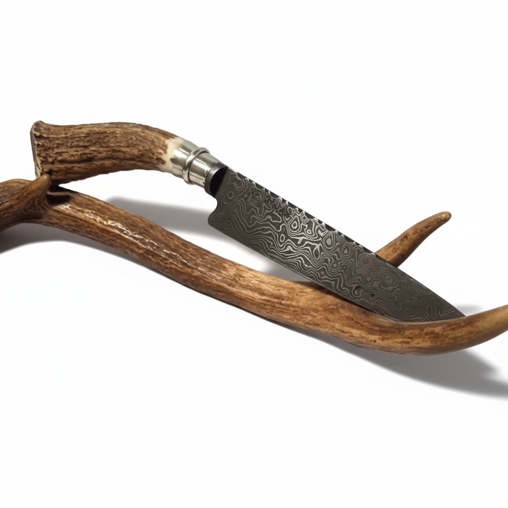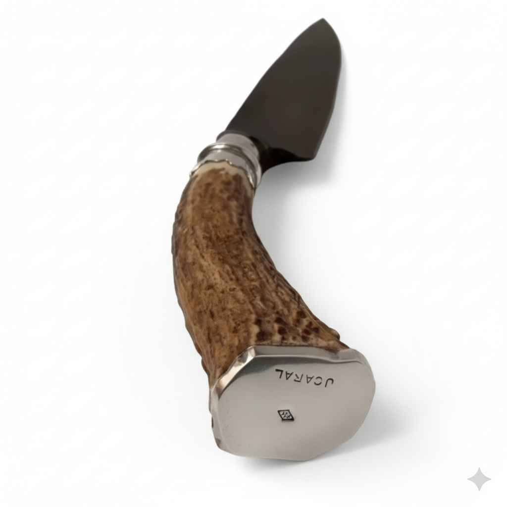 Pieza única, hoja de acero damasco de 15 cm con lomo trabajado, realizada por el artesano Rocha y hermoso cabo realizado en asta de ciervo con virola y tapa en plata 900, se entrega con su vaina tejida fina. pieza para entendidos. Trabajo realizado por el platero/soguero Julio Casal @julio.casal.platero