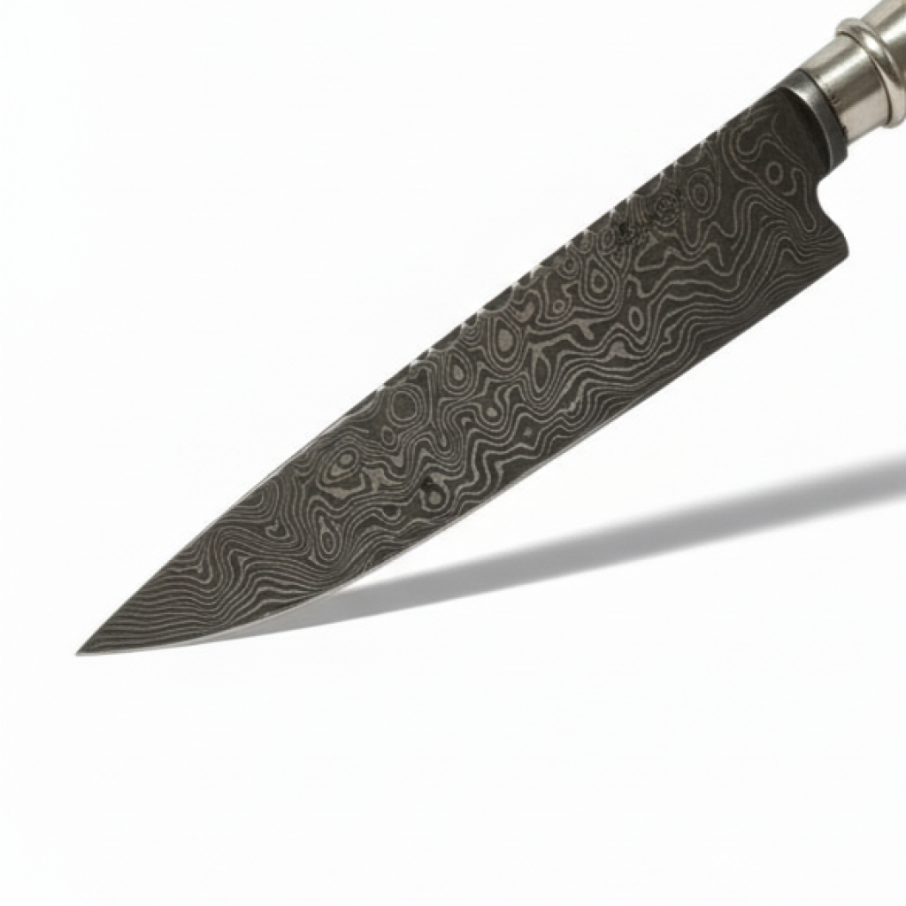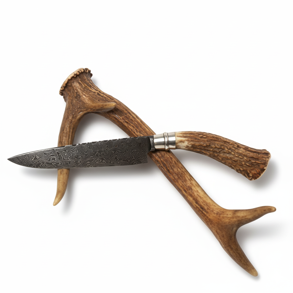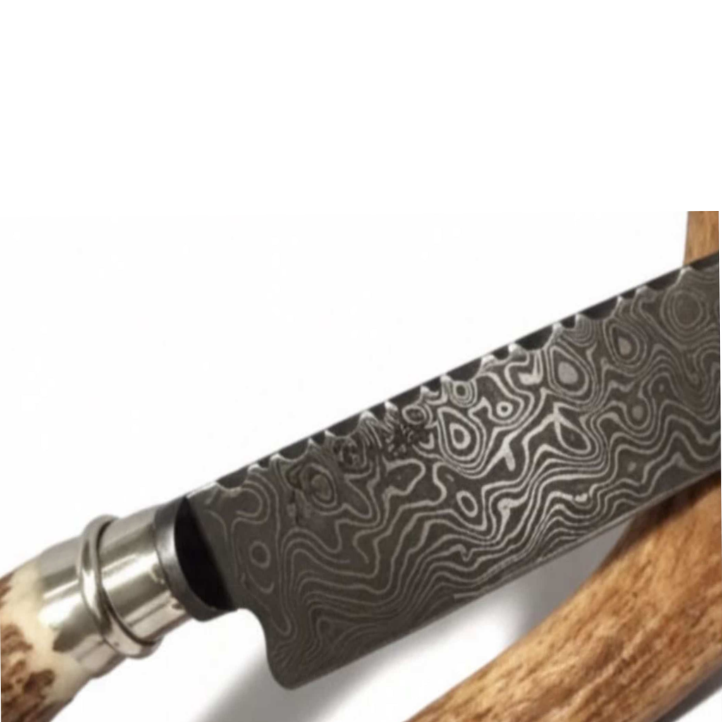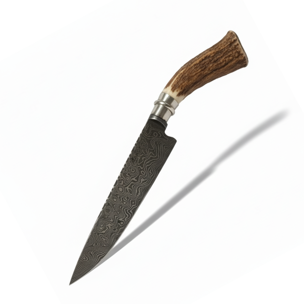 Pieza única, hoja de acero damasco de 15 cm con lomo trabajado, realizada por el artesano Rocha y hermoso cabo realizado en asta de ciervo con virola y tapa en plata 900, se entrega con su vaina tejida fina. pieza para entendidos. Trabajo realizado por el platero/soguero Julio Casal @julio.casal.platero